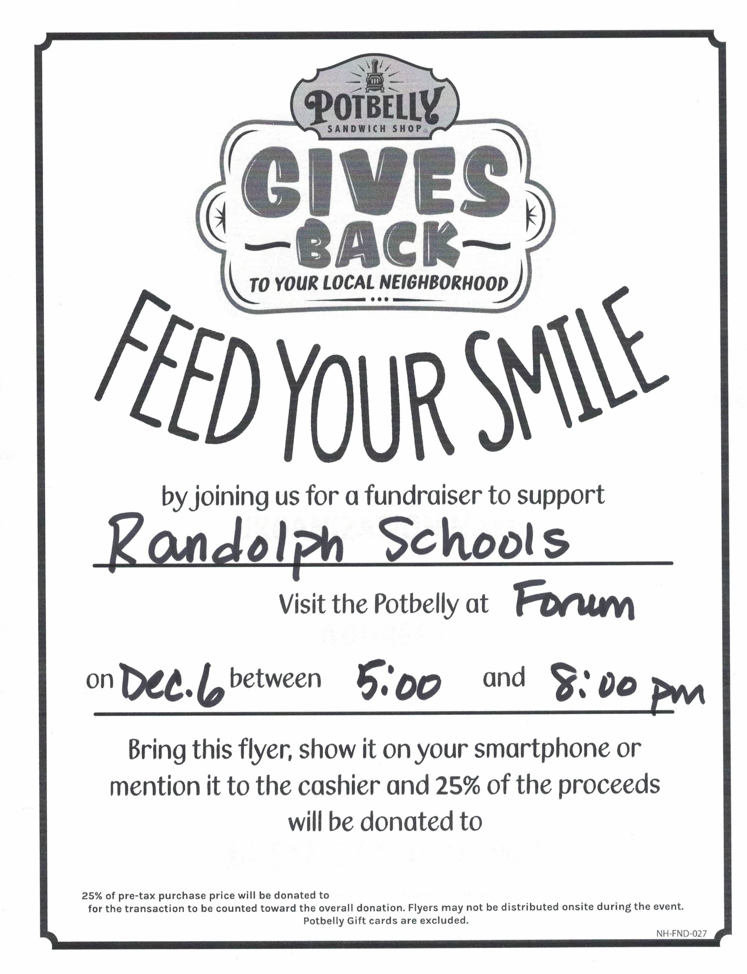PTO December Spirit Night Please join PTO for a fundraiser to support the Randolph Schools 25% of the proceeds will be donated Bring the flyer, show it on your phone or mention it to the cashier Published December 3, 2018 Print
